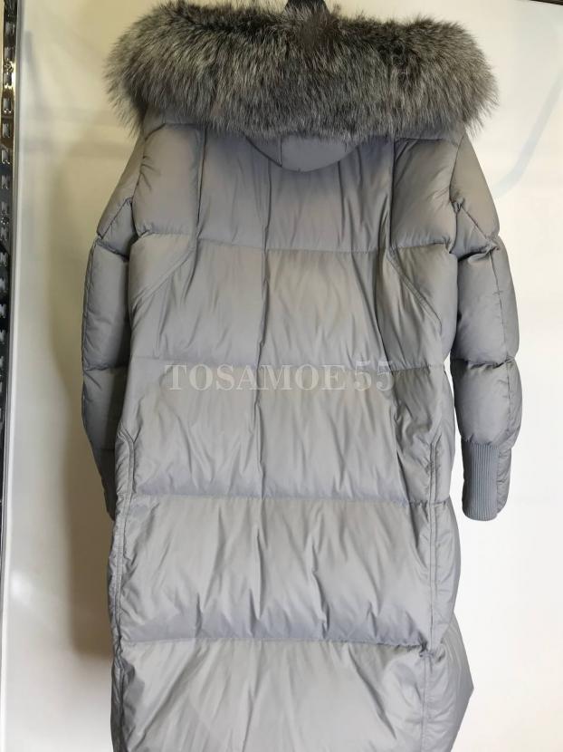 Длинный серый пуховик с чернобуркой