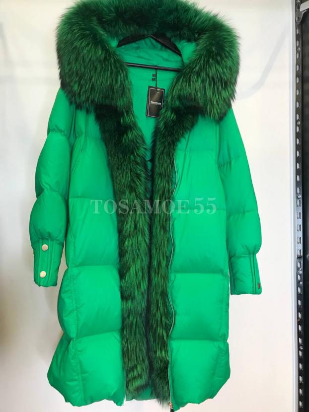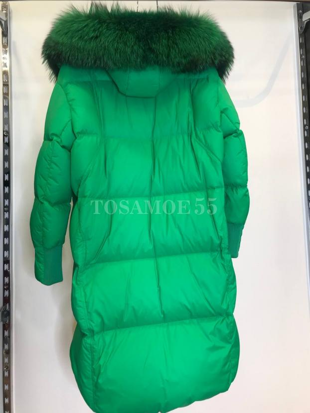 Светло-зеленый длинный пуховик с мехом енота
